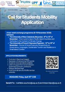 The University of New Caledonia (UNC) and the University of French Polynesia (UPF), in partnership with Solomon Islands National University (SINU) and the Pacific Islands Universities Regional Network (PIURN), are launching a fully funded joint mobility programme entitled: